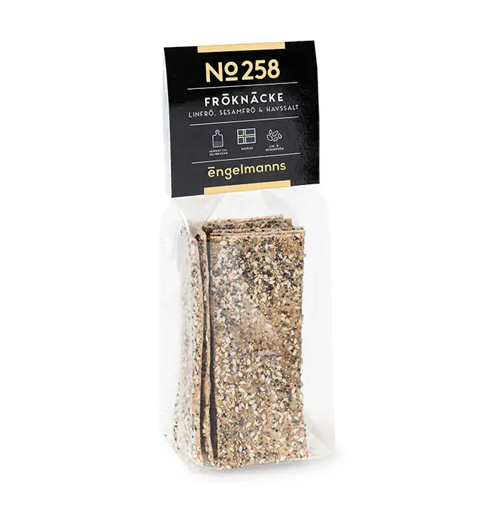 Knapriga knäckebitar av grovmalen råg och dinkelmjöl. Toppade med lin- och sesamfrön och smaksatta med flingsalt. Perfekt format för festens goda snittar.