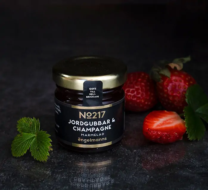 En söt jordgubbsmarmelad förgylld med lyxig champagne. Prova den gärna tillsammans med Engelbrie Creamy eller Délice de Bourgogne. Perfekt storlek för den lilla Delibrickan.