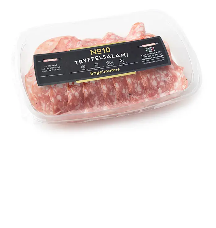 Lufttorkad salami med mild smak av tryffel. Fantastisk, oemotståndlig och helt underbar! Vår tryffelsalami passar perfekt till ost- och charkbrickan och är ett måste för alla tryffelälskare där ute.